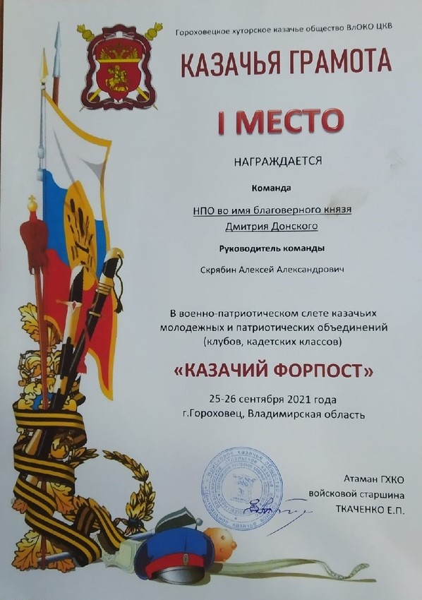 Поздравляем педагога А.А. Скрябина и воспитанников НПО во имя бл. князя Дмитрия Донского с победой в военно-патриотическом слете «Казачий форпост» в городе Гороховец.